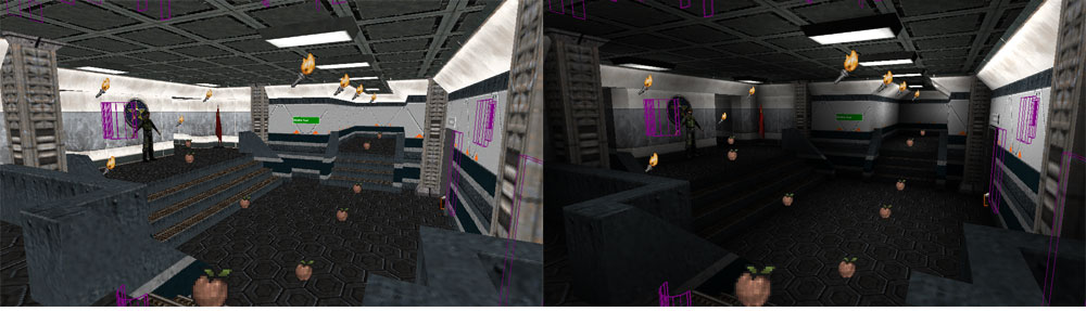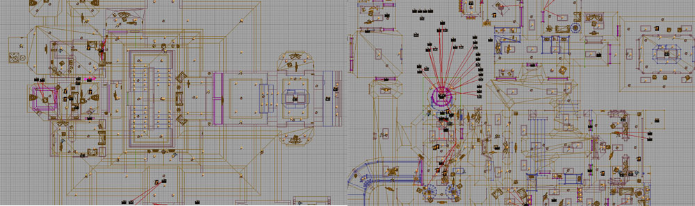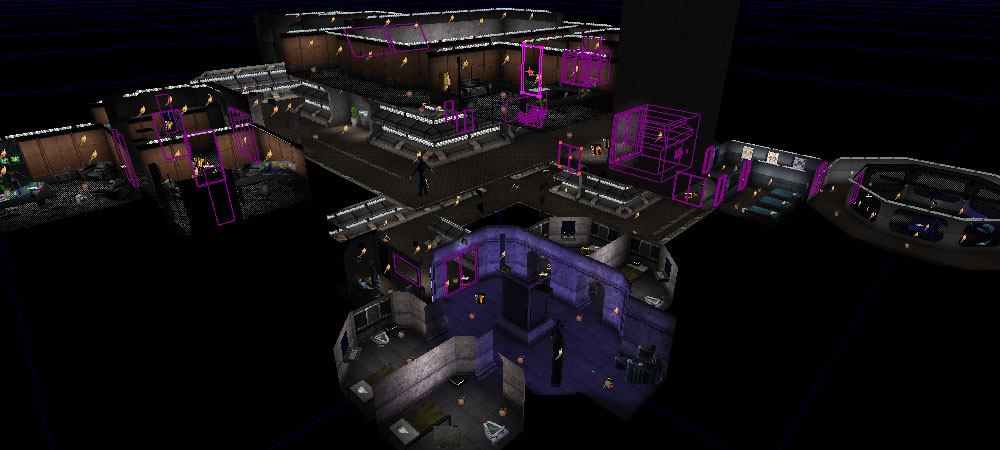 Layout Process ![]() The layout process for the Deus Ex maps went through several iterations mainly because there was so much the game allowed you to add. In the end I kept the scope of my building to two new UNATCO Headquarters. Both focus on different aspects of the game. For one I wanted to add new classes of NPCs, a new player character as well as some new textures. For the other I focused on what I could accomplish with editing brush vertices and what I could come up with using UnrealEd’s 2D editor. Each map features new dialog, numerous movers and use of all of the games specific triggers. I knew for each I wanted to make more complicated elevators to get away from the normal plain box ones that most of the games at that time used. So in one I used the 2D editor tool to make a more interesting shape and for the other I used a cylinder with doors that opened in a circle rather than side to side. Finally I wanted the bases to seem much more high tech than the normal HQ featured in the original game so I added things like lit map tables, a situation room, computer ops and so on. Building Process ![]() Most of the time it took to build both maps dealt with creating new brushes. I would make a brush either from the 2D editor or by using the subtraction/intersection method. For the doors I mostly used movers. To control the elevators over multiple floors I used a combination of flag, sequence and dispatcher triggers. I used multiple floors to help with zoning. To make more interesting hall ways and rooms I would edit a brushes’ vertices to give ceilings a slight angle rather than just have them be a box. After the brush work I started to place decorations/static meshes and adding furniture type movers such as workable lockers. Finally I used many of the unique NPC properties such as having them sit down and wander an area. I also set pathnodes such that NPCs could patrol an area. Lighting Process ![]() With the limited lighting options in this version of the Unreal engine setting this up was fairly straight forward. I used many colored lights for things like computer monitors and medical rooms and I relied much more on zone lighting than I have done in maps since. Final Steps ![]() In the final stages I added sound. After this I filled in the features that required text entry such as conversations, news kiosks, data pads and opening mission text. Because of all the –extras- you could play around with in Deus Ex maps I found myself editing and tweaking the maps for a fairly long time. That had more to do with enjoying all of its features rather than build times. Deus Ex supported a ton of mapping features for its time that I wish were included in editable maps today. |
