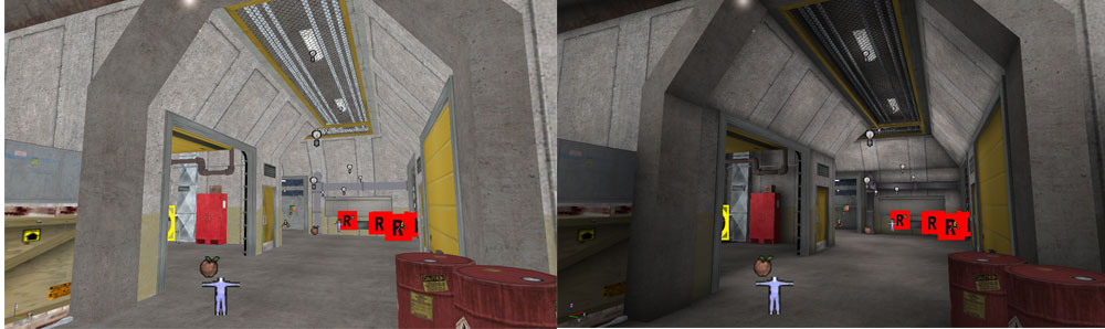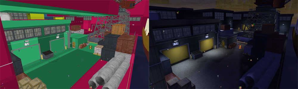 Layout Process ![]() There were three things I used as guidelines when laying out this map. 1) There must be many ways to enter the building. 2) As it supports multi-player modes it must be setup in such a way that the enemies spawn in different positions in –lots- of places all over the map. 3) The map should be very large but with lots of detail. Though the warehouse theme is way over done I decided to go with it anyway as I thought I could offer something different by making the outside and lower level larger and play just as important a role as the first floor level of the building. I also thought I could add some vertical stealth gameplay by utilizing the building’s roof. Also I thought I could get away from the crate maze by using the loading area of the floor level portion of the building for ranged gun play while using the three story office section as a more of a close combat gameplay area. In laying out the map I had to consider the different starting points for the different modes of play the map would support. As such there are four starting points for multi-player and one for single-player as this starting position coincides with the mission text. The guideline for multiple entry points helps accommodate the fact that it is a tactical game not a straight up run and gun shooter. Therefore the player needs to be offered more options for how they will enter the building and plan their own strategy. This helps foster some ownership of the players team. Once these criteria were in place it didn’t take long to sketch out the map. Since it uses the Unreal engine I already had a good idea of the proportions I would be using in terms of doorways and the like. Once sketched out I began the building phase. Building Process ![]() The building process for this map was very long. This mainly had to do with the amount of time I had to spend re-cutting the map for efficient zoning. The interior areas didn’t prove difficult but because I had such a large and open outside area I had to do a great deal of brush work, via editing vertices, to make sure my zone portals blocked out as much as they could and didn’t allow the player to view to many zones at once. While this wasn’t difficult from an application stand point, as I was used to zoning a map, it did become somewhat of a brain teaser as I had to constantly be aware that anything I put outside could have a significant effect on performance. Once the zones were worked out it was simply a matter of placing the detail static meshes. This took a while as the map is large and, like the SWAT 4 map, is realistic and thus the static meshes had to be placed just so to aid in the illusion that it was an actual location. To further enhance the realism all of the windows in the map are breakable. Also, like the SWAT 4 map, the activity of the world makes sense from a logical standpoint. For instance the trucks in the warehouse are not just there arbitrarily but are having cargo lifted off of them, forklifts outside are carrying cargo, machines are running and putting out smoke, etc. It’s important not to simply place realistic meshes simply because they are realistic but rather place them in the map because they are part of what would be going on in the world. Also since it is a cold map with snow on the ground I made sure to enable the zones so that you could see the breath of your NPC team mates. I think these are details that help sell a map. Finally the enemies had to be placed. To help with replay ability and to account for the multi-player experience a lot of spawn points were placed and percentages were assigned to each as to where enemies would appear. Also in this phase enemy templates were created so many of the enemies would have a wider variety of weapons they may spawn with as well as many more possible responses in seeing the player’s team. Lighting Process ![]() The lighting process in this map was only time consuming because the map is so large and has so many static meshes which all can take light differently. A lot of playing around with them takes place (as with all Unreal engine games) before the lighting works well. Also, as with the SWAT 4 map, the map had to pay close attention to the fact that every light source had to be accounted for as it is a realistic location. The brightness and radius had to be logical as well. If not the player may notice it and be pulled out of the experience. Final Steps ![]() The final stage of this map was adding sound and testing. Because this map supports so many gameplay modes it was tested a great deal by friends and members of the Rainbow Six community. I received a lot of great feedback, especially in the multi-player portion and was able to really tighten that up. As stated before because I am a stickler for performance I was pleased that I never heard from anyone that had trouble running the map despite the fact that it was large and contained so many static meshes. This map was released in two community map packs. |